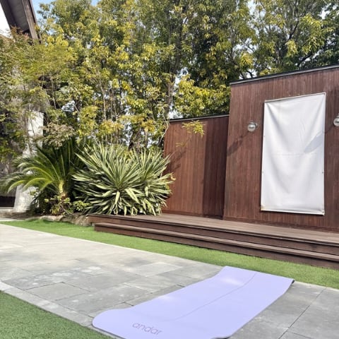 結婚式場のチャペルガーデンで朝の光と緑に包まれながら行う特別なモーニングヨガ。